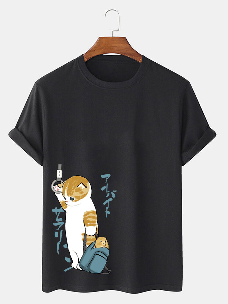 Regular Fit Pocket Black Cat Print Cotton T-Shirt