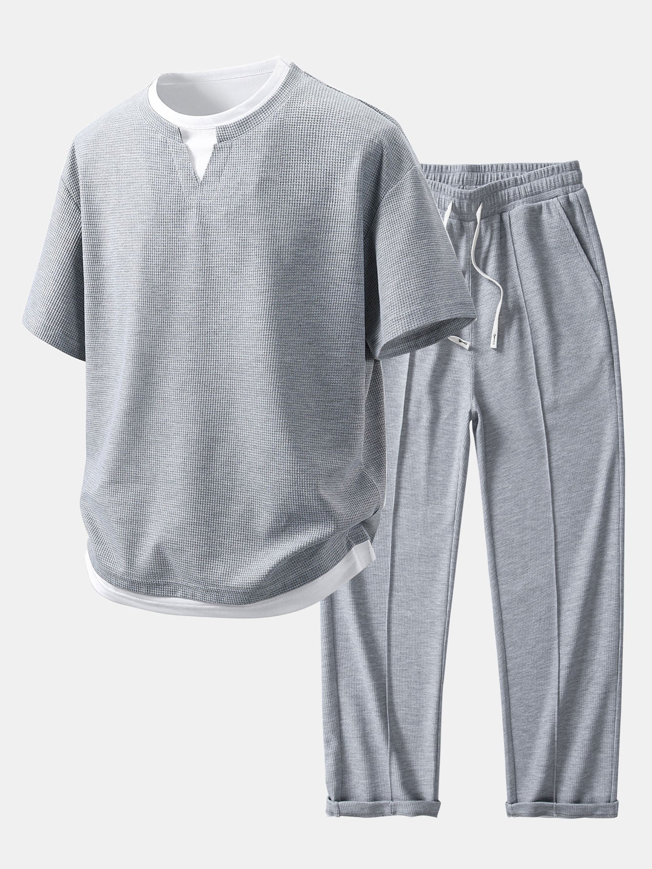 Relax Fit 2 In 1 Notched Collar Waffle T-Shirt & Waffle Pleated Pintuck Straight Leg Pants