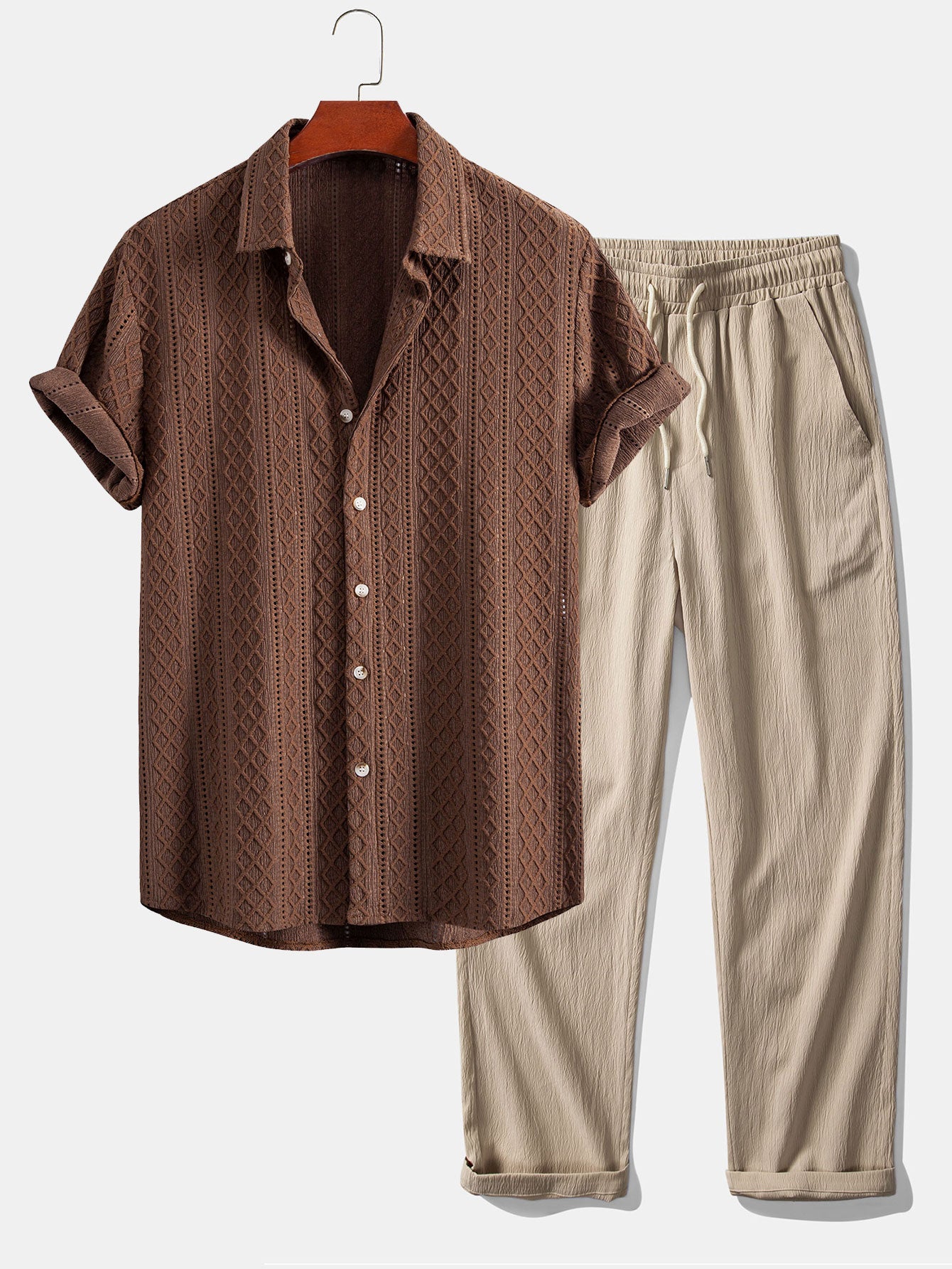 Geometry Rhombus Jacquard Button Up Shirt & Crinkle Textured Straight Leg Pants