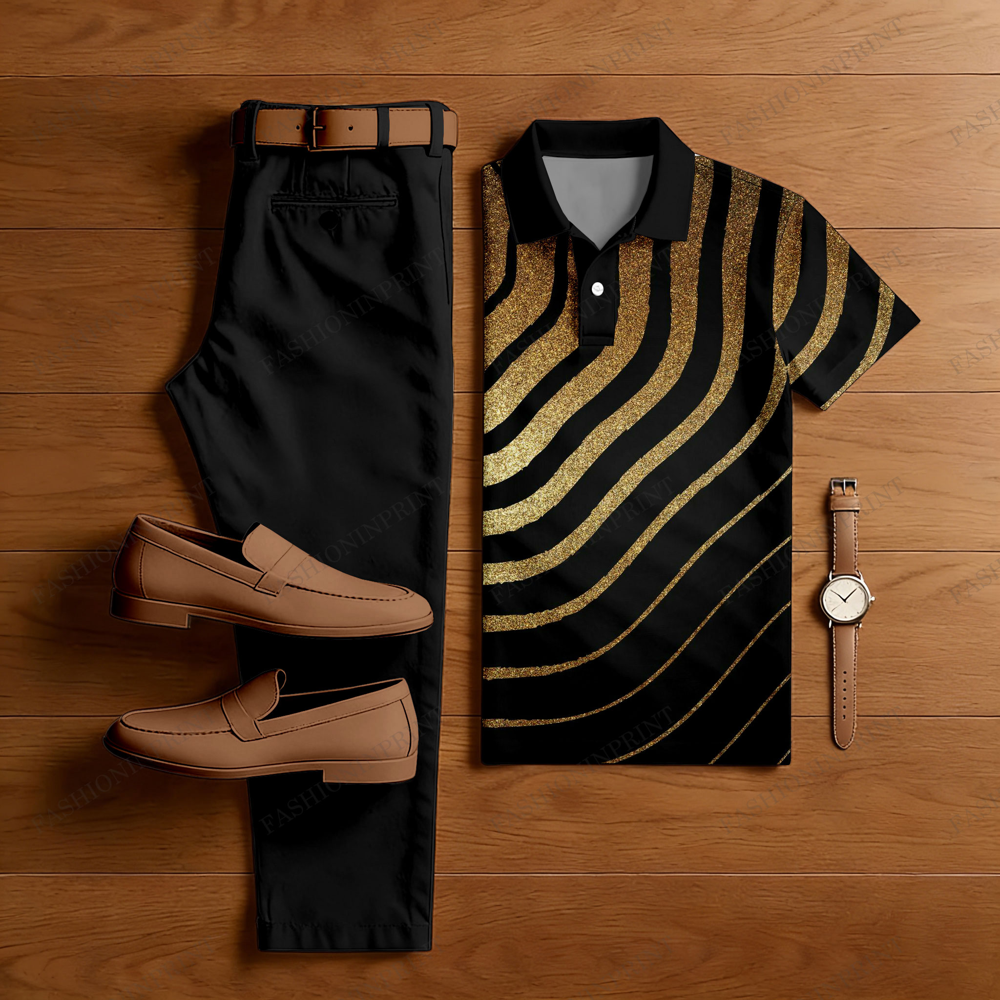Men's Casual Black & Gold Color Matching Zibra Printed Short Sleeved Polo Shirt & Trousers Two-Piece Set