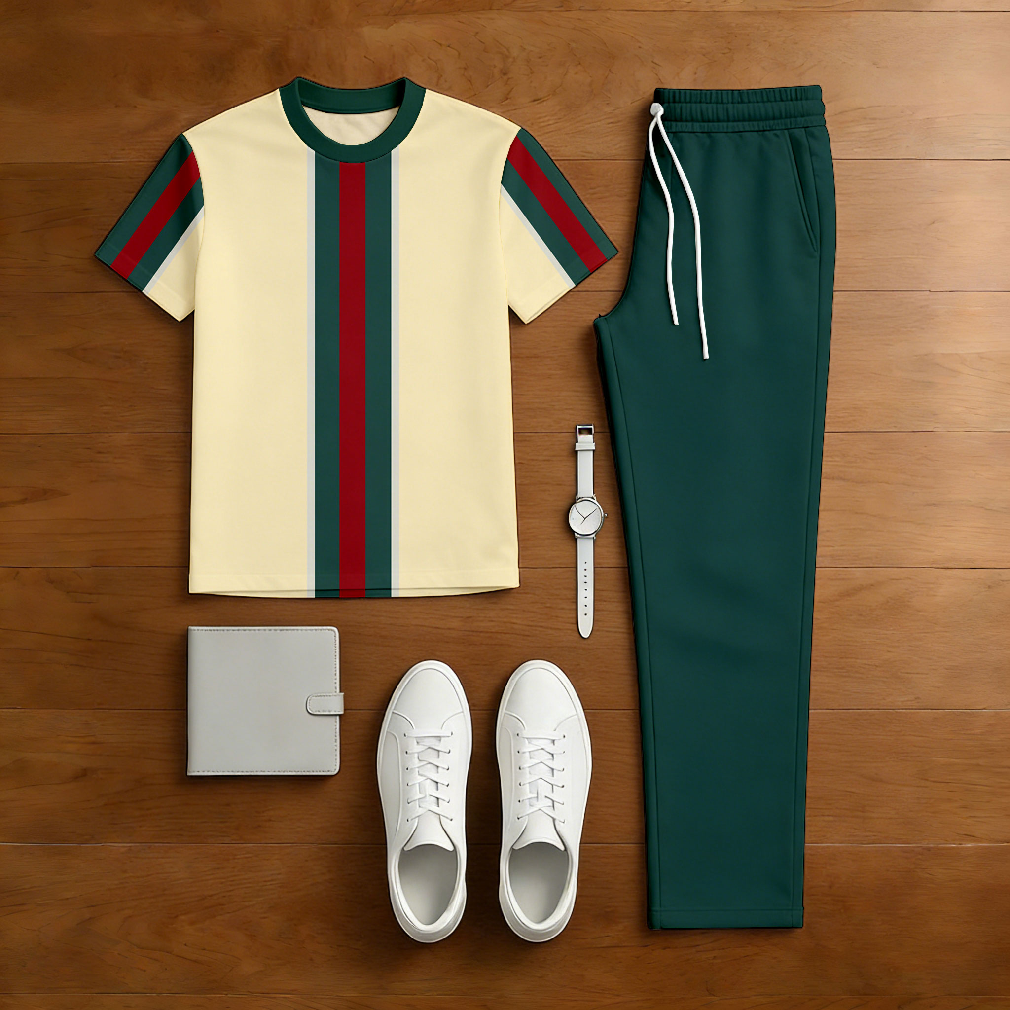 Men's Casual Green & Yellow Color Matching Striped Printed Short Sleeved Polo Shirt & Trousers Two-Piece Set