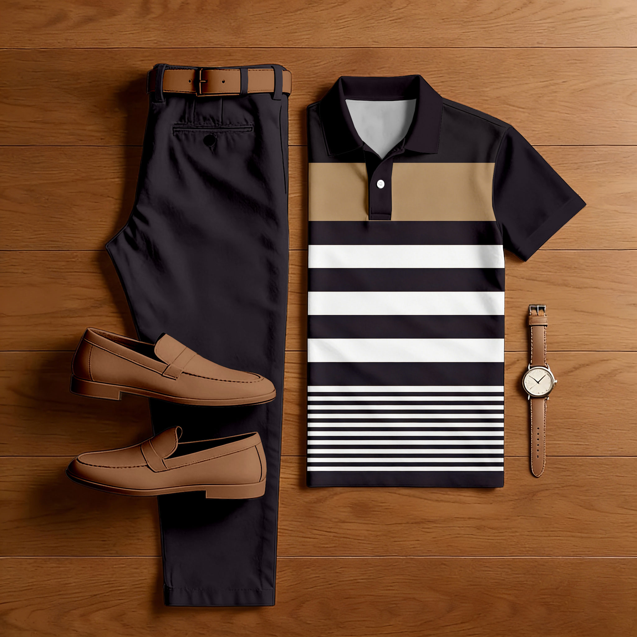 Men's Casual Khaki Color Matching Striped Printed Short Sleeved Polo Shirt & Trousers Two-Piece Set