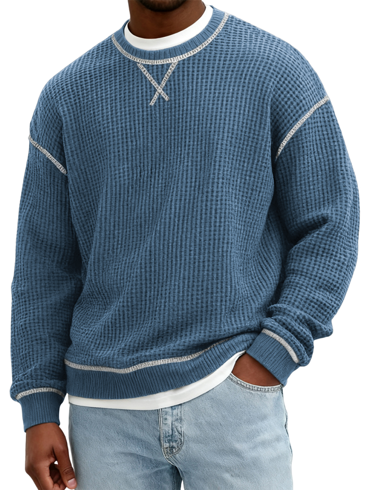 Men's Waffle-Knit Crew Neck Sweater with Contrast Trim
