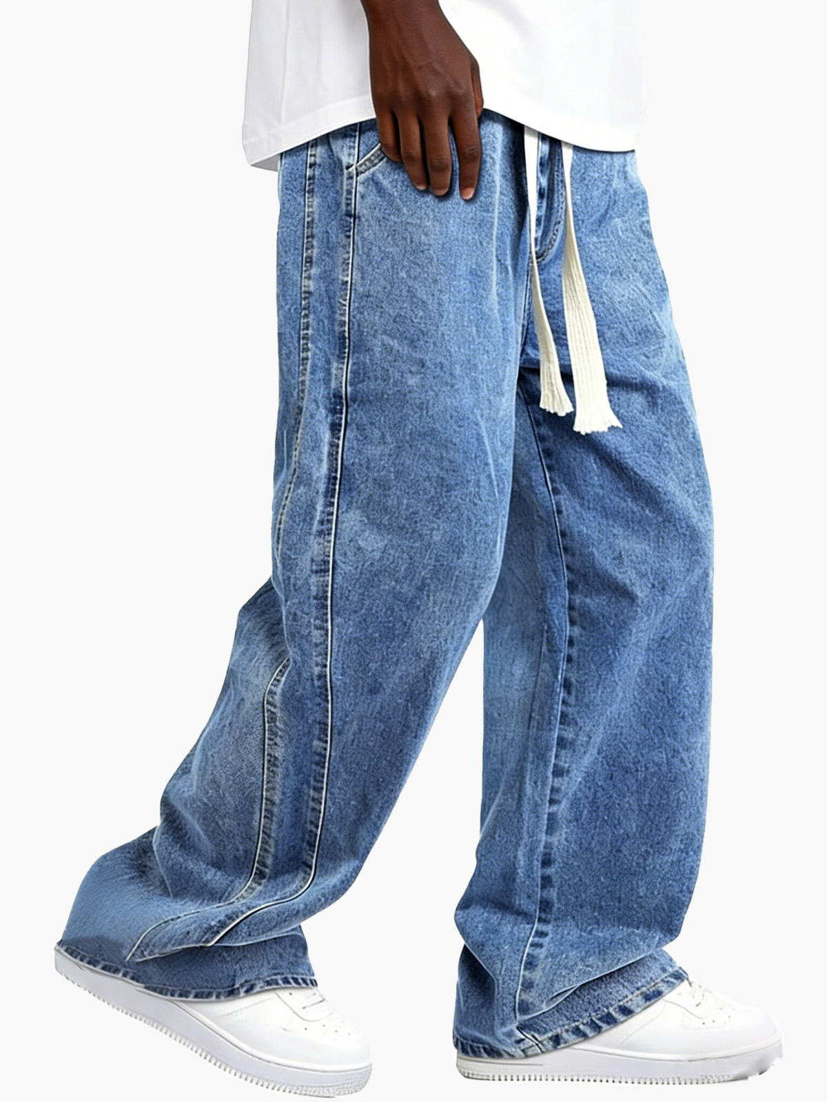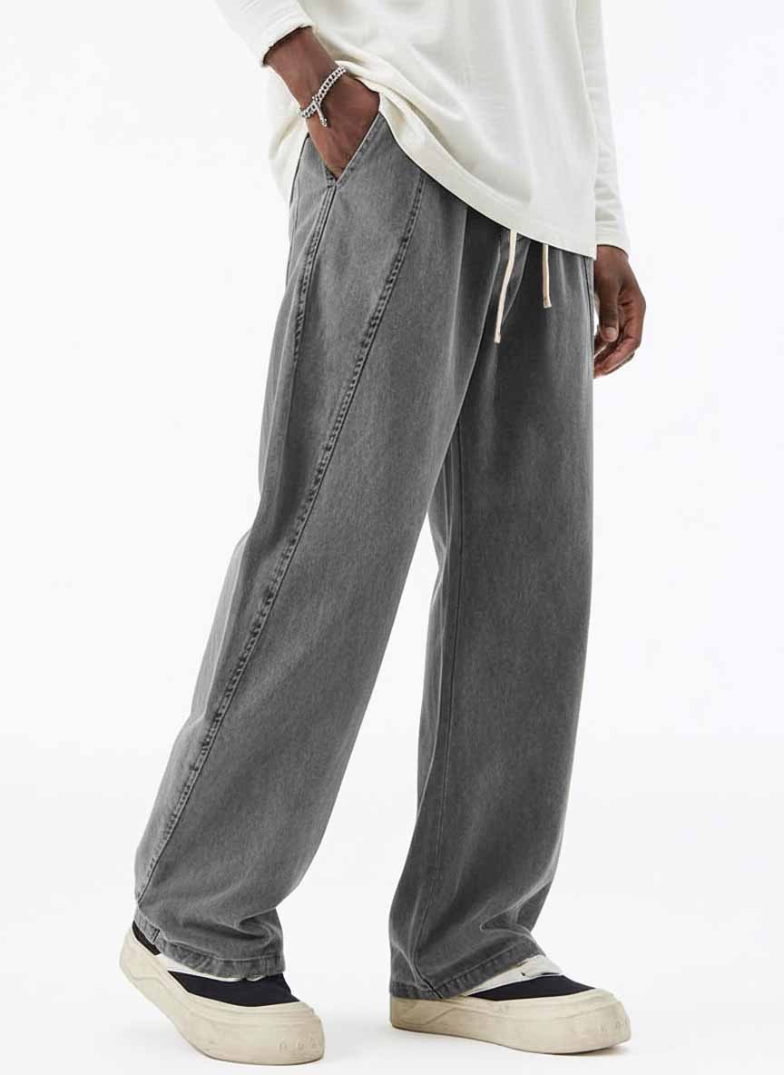 Men's Casual Jacquard Loose Solid Color Drawstring Wide-leg Straight Trousers