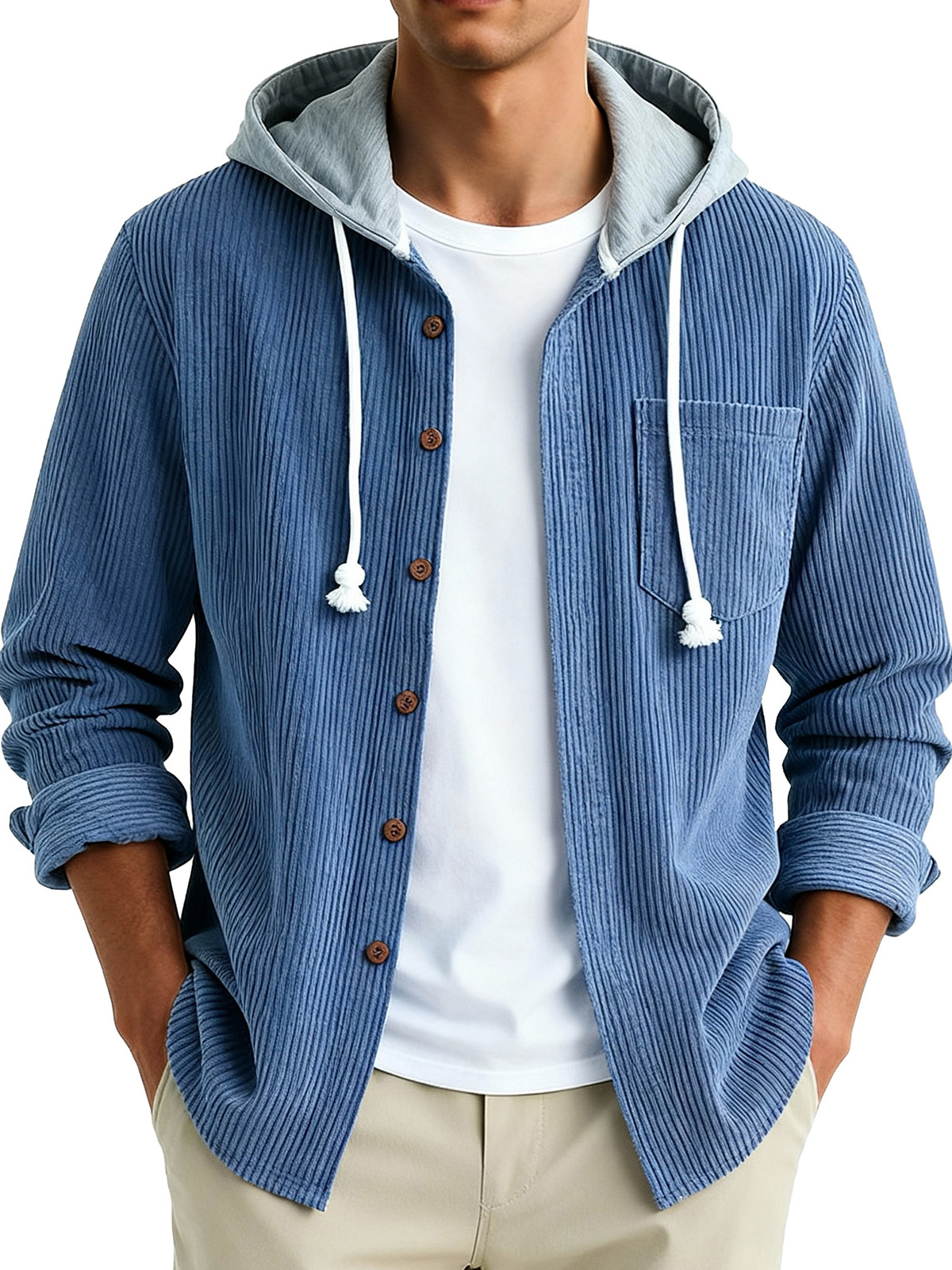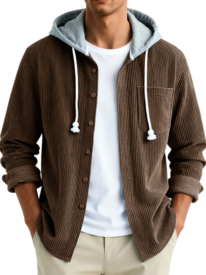Men's Fashion Vintage Stitching Pit Strip Long Sleeve Pocket Hooded Shirt