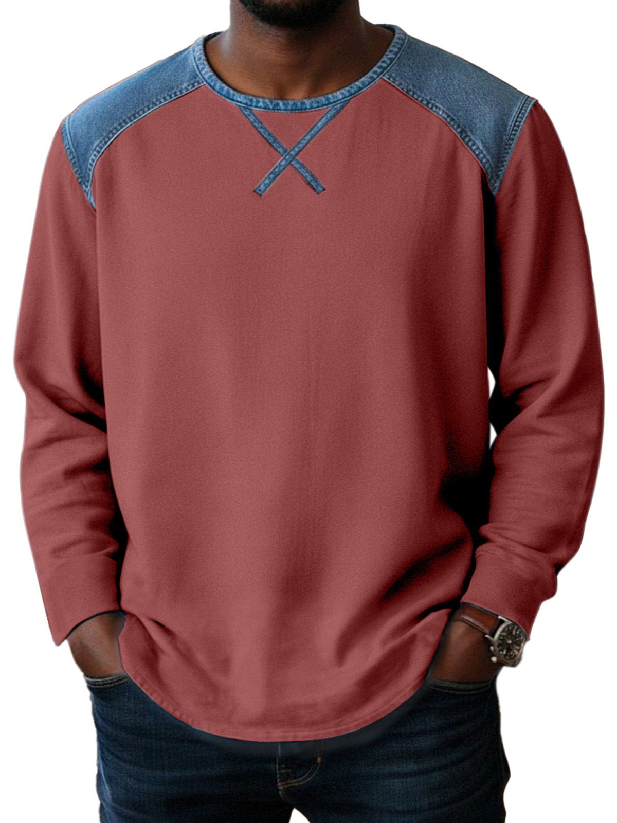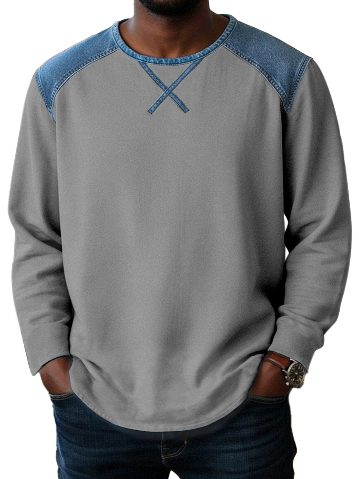 Basic Casual Inverted Triangle Design Spliced round Neck Long-sleeved T-shirt