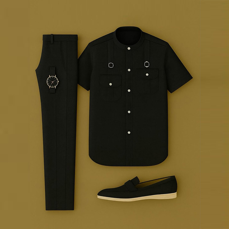 Men's Casual Black Color Short Sleeved Stand Collar Shirt & Trousers Two-Piece Set