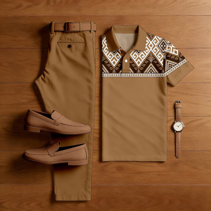 Men's Casual Brown Color Matching Ethnic Styled Printed Short Sleeved Polo Shirt & Trousers Two-Piece Set