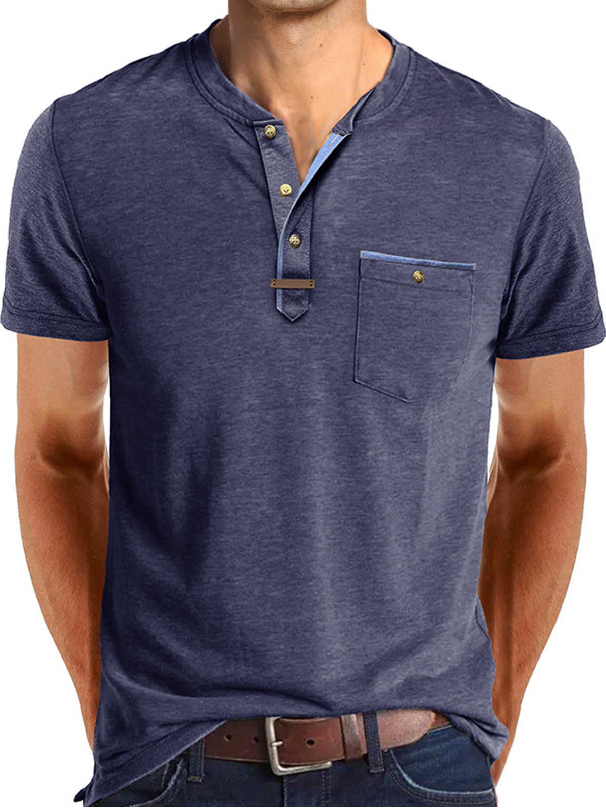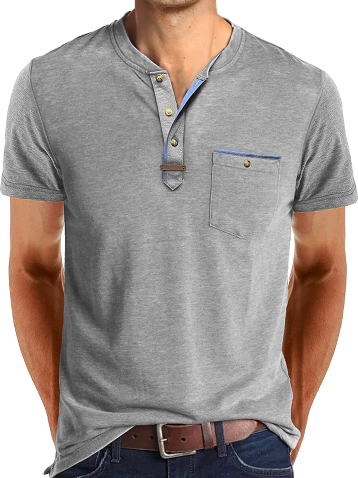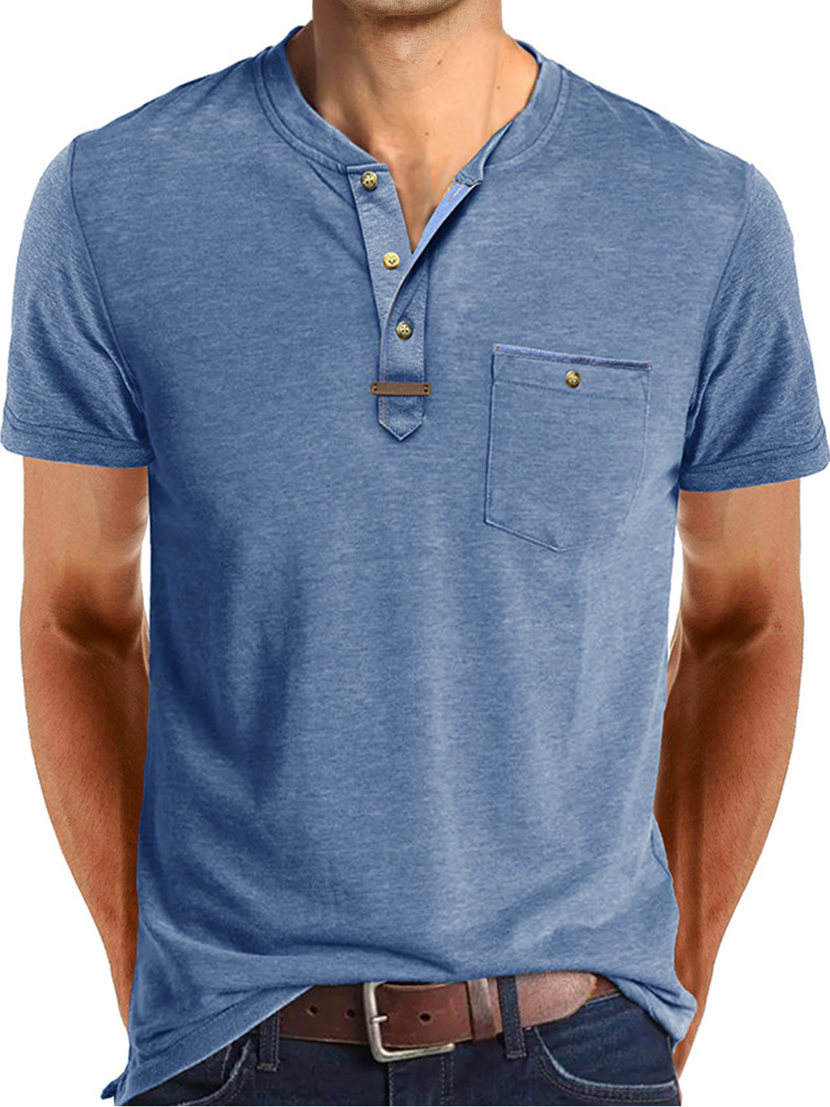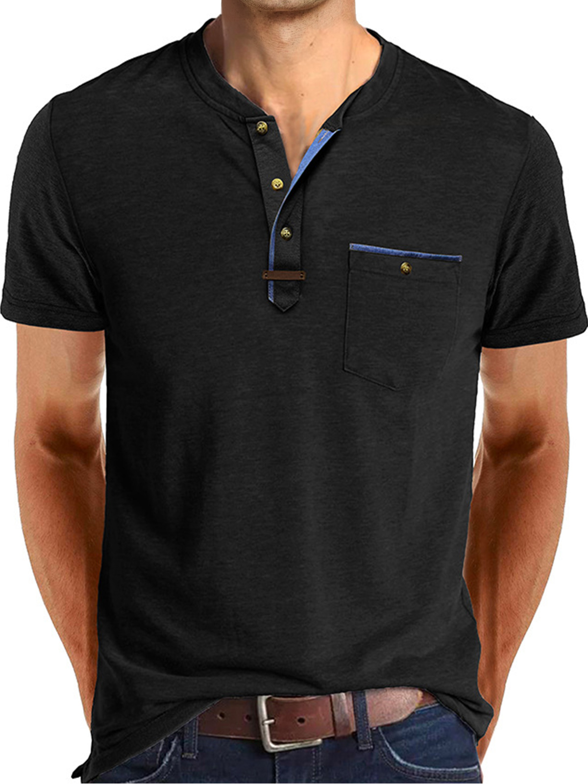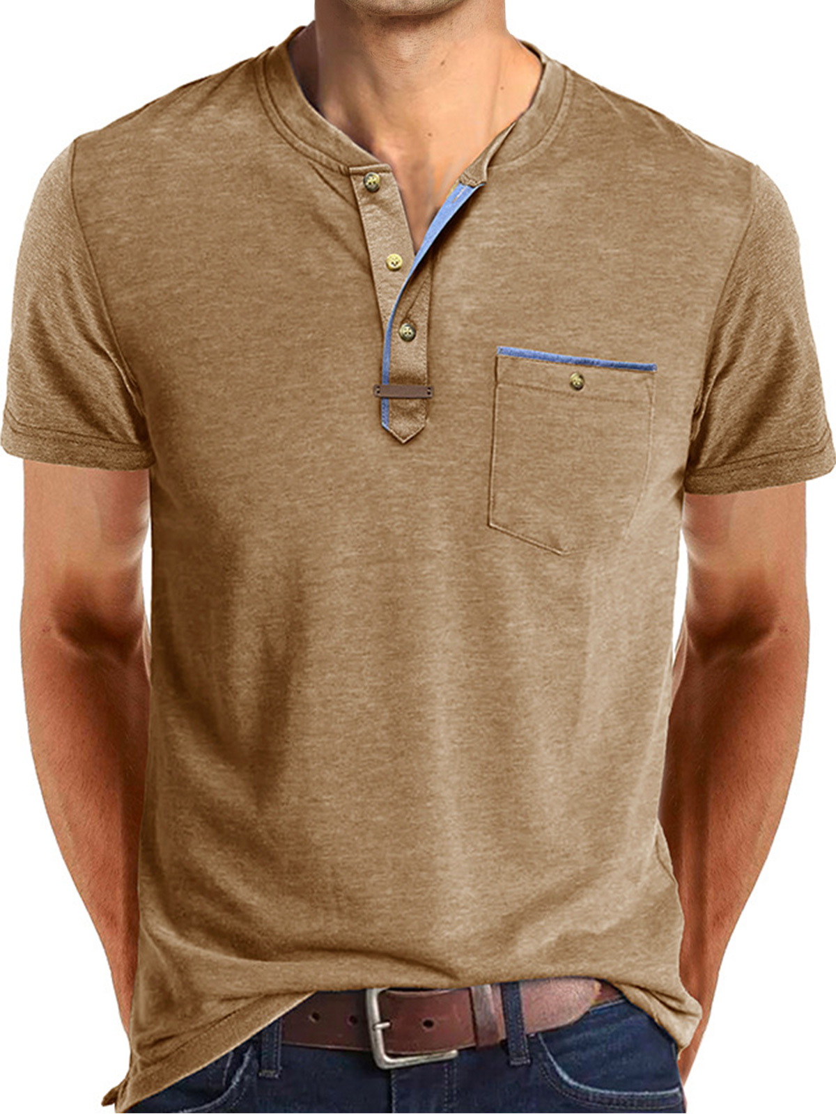 Men's Casual Button Solid Color Pocket Short Sleeve Henley Shirt