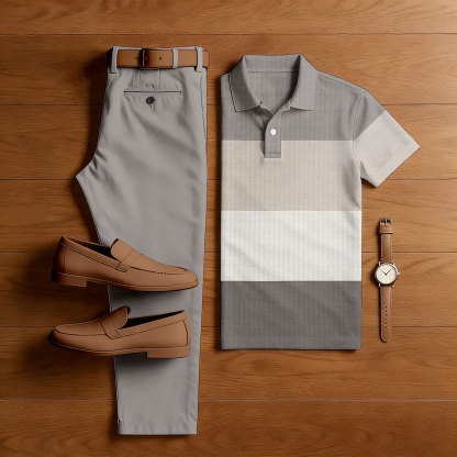 Men's Casual Gray Khaki Color Matching Printed Short Sleeved Polo Shirt & Trousers Two-Piece Set