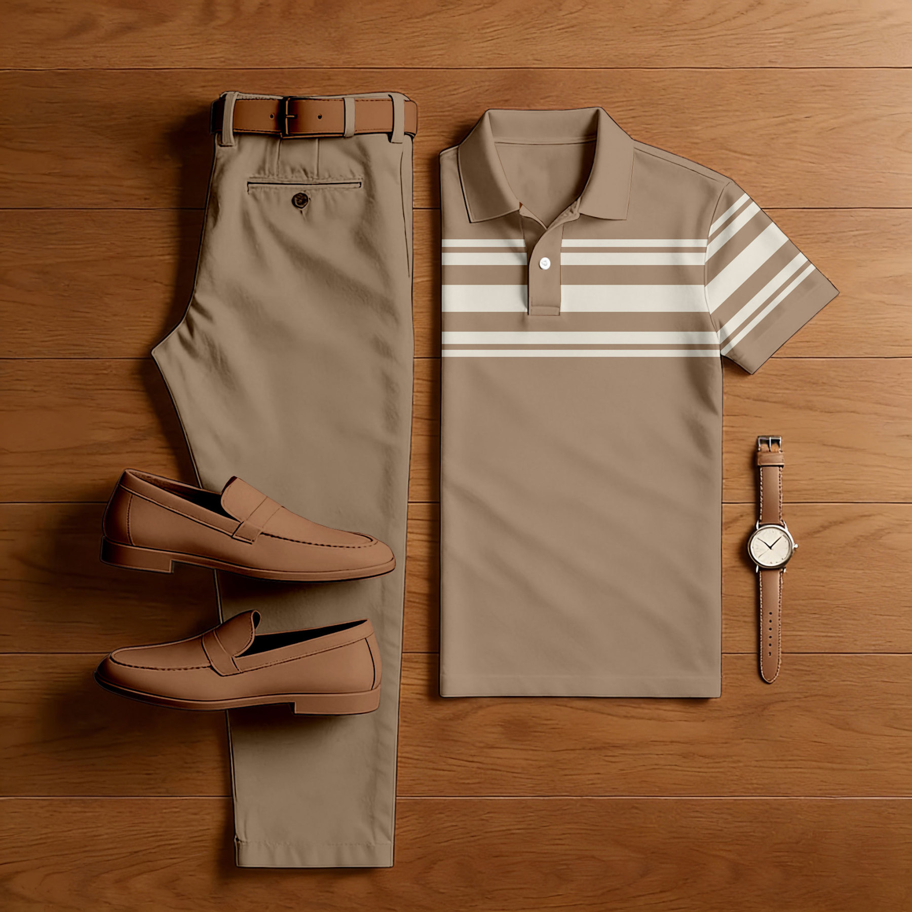 Men's Casual Khaki Color Matching Striped Printed Short Sleeved Polo Shirt & Trousers Two-Piece Set