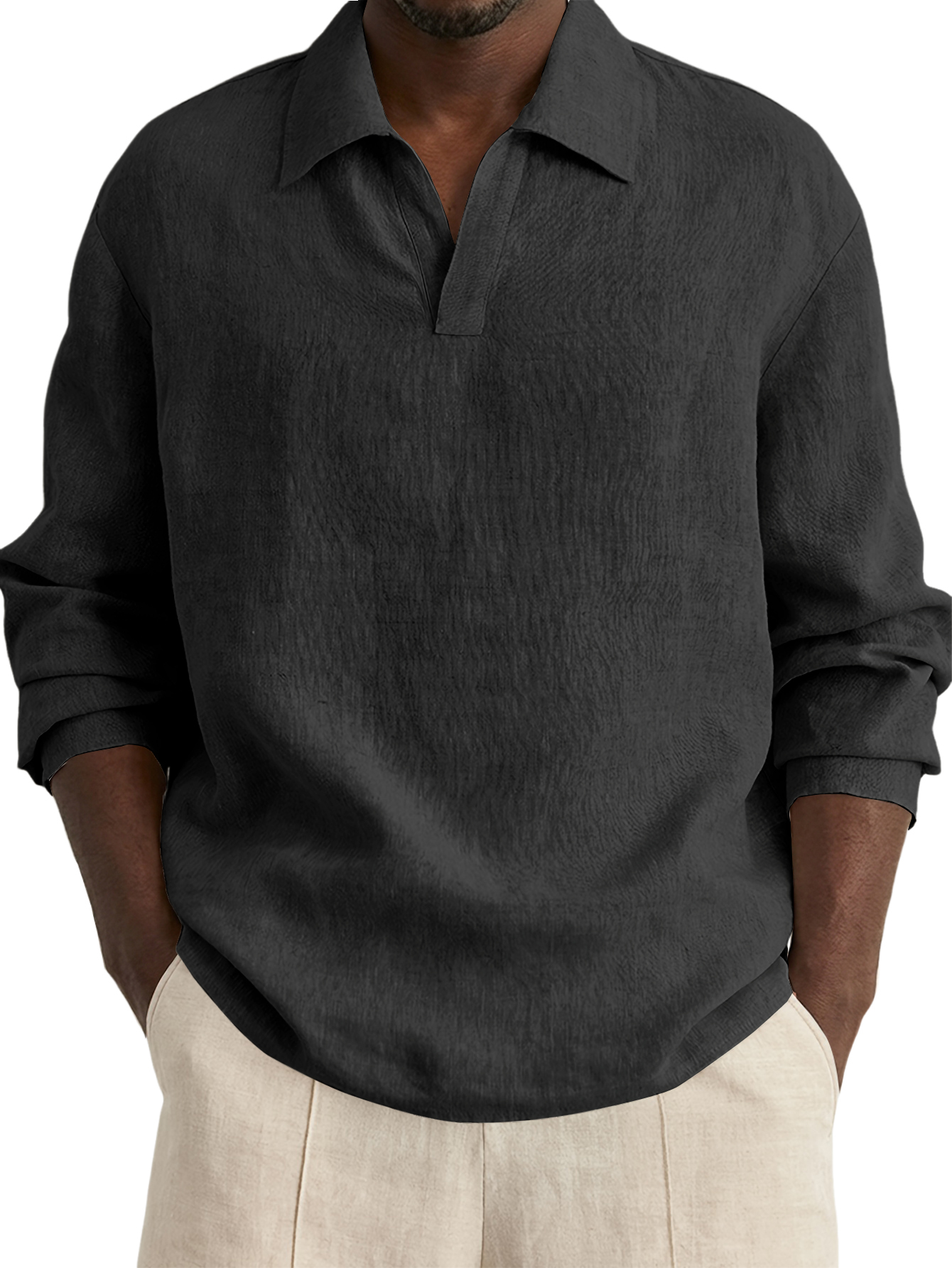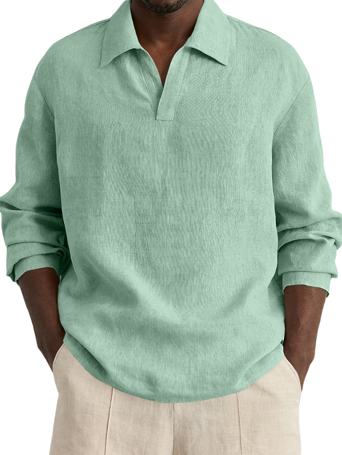 Men's Casual Simple Cotton Linen V-Neck Long-Sleeve Shirt