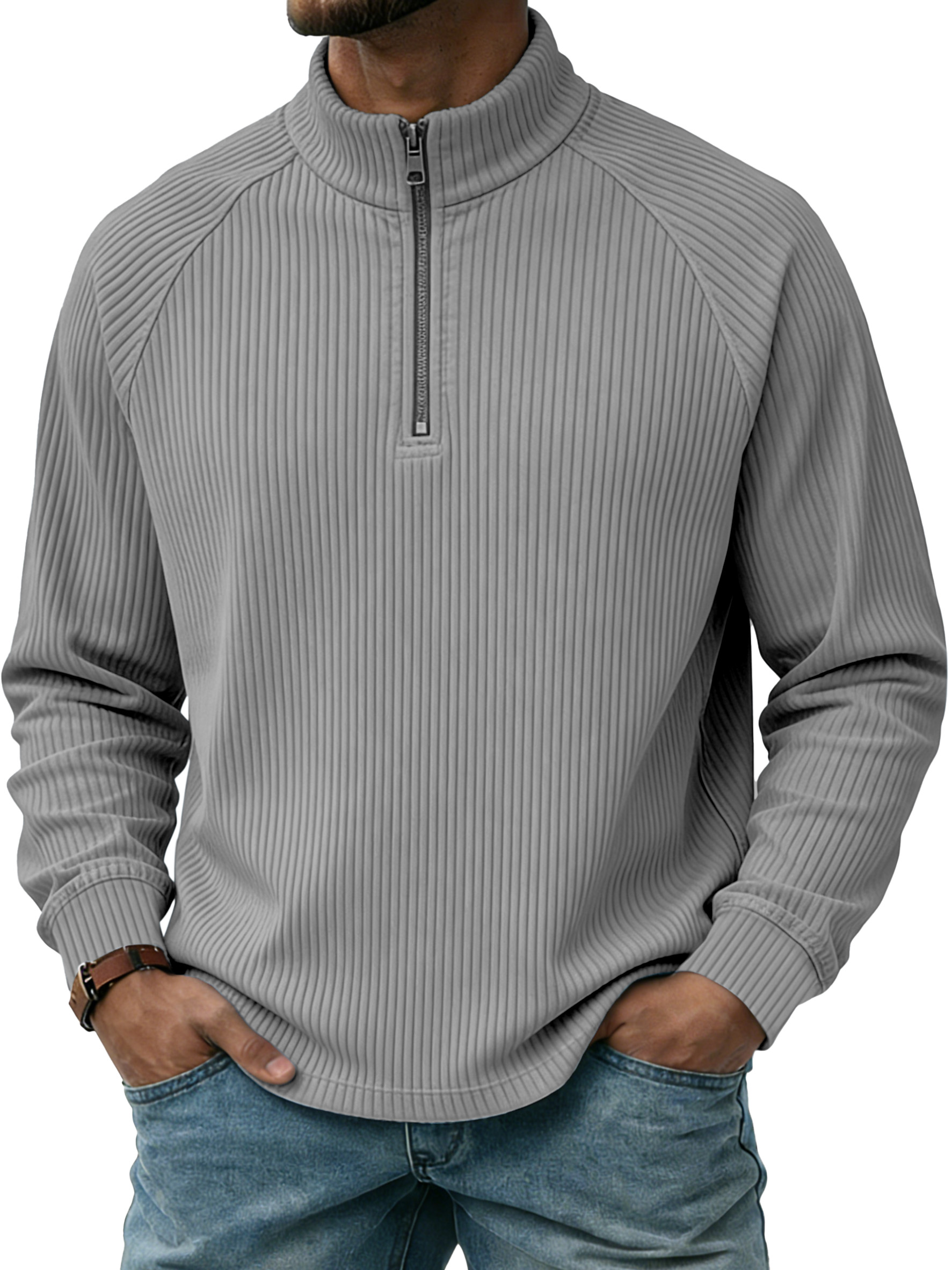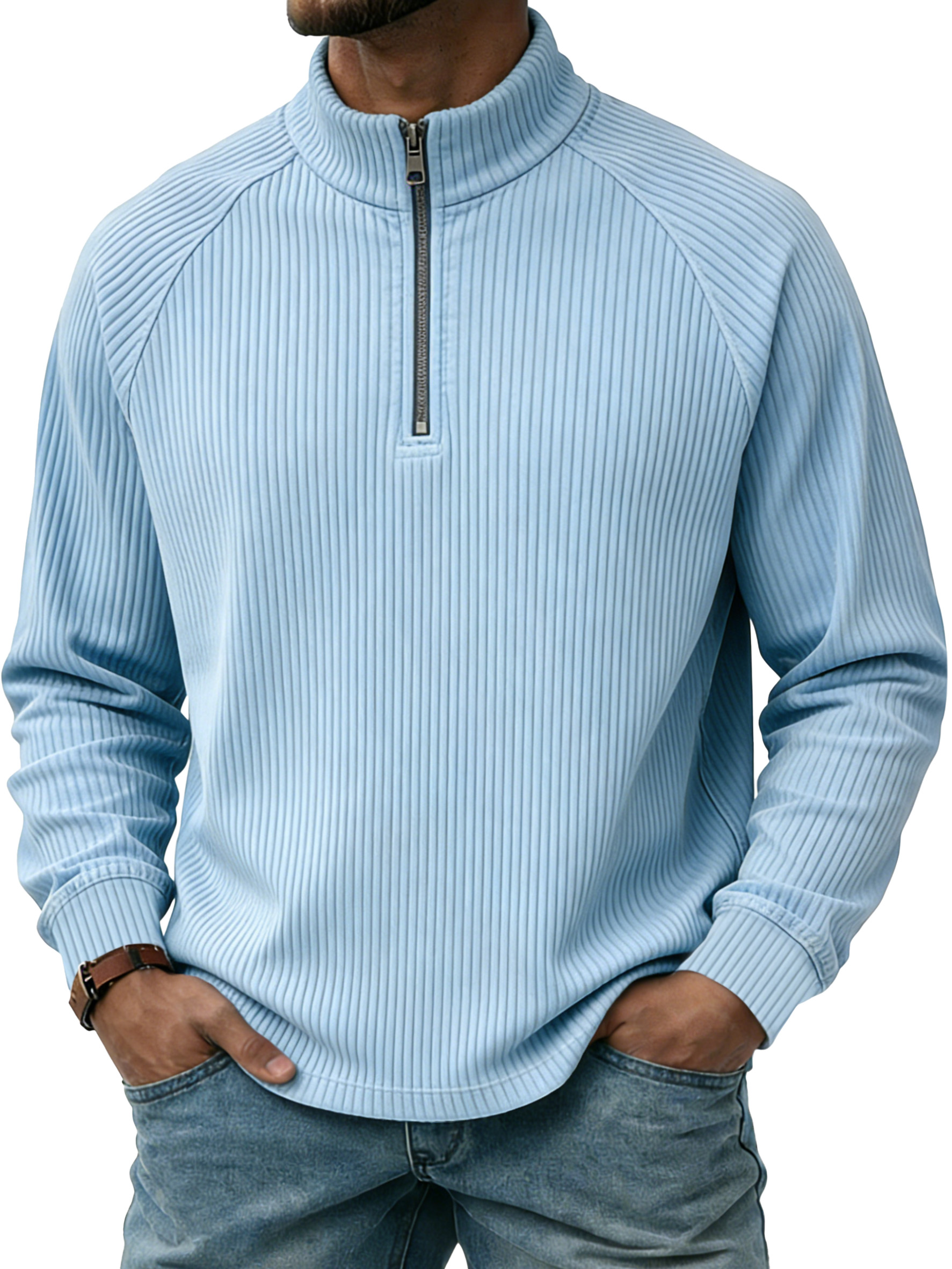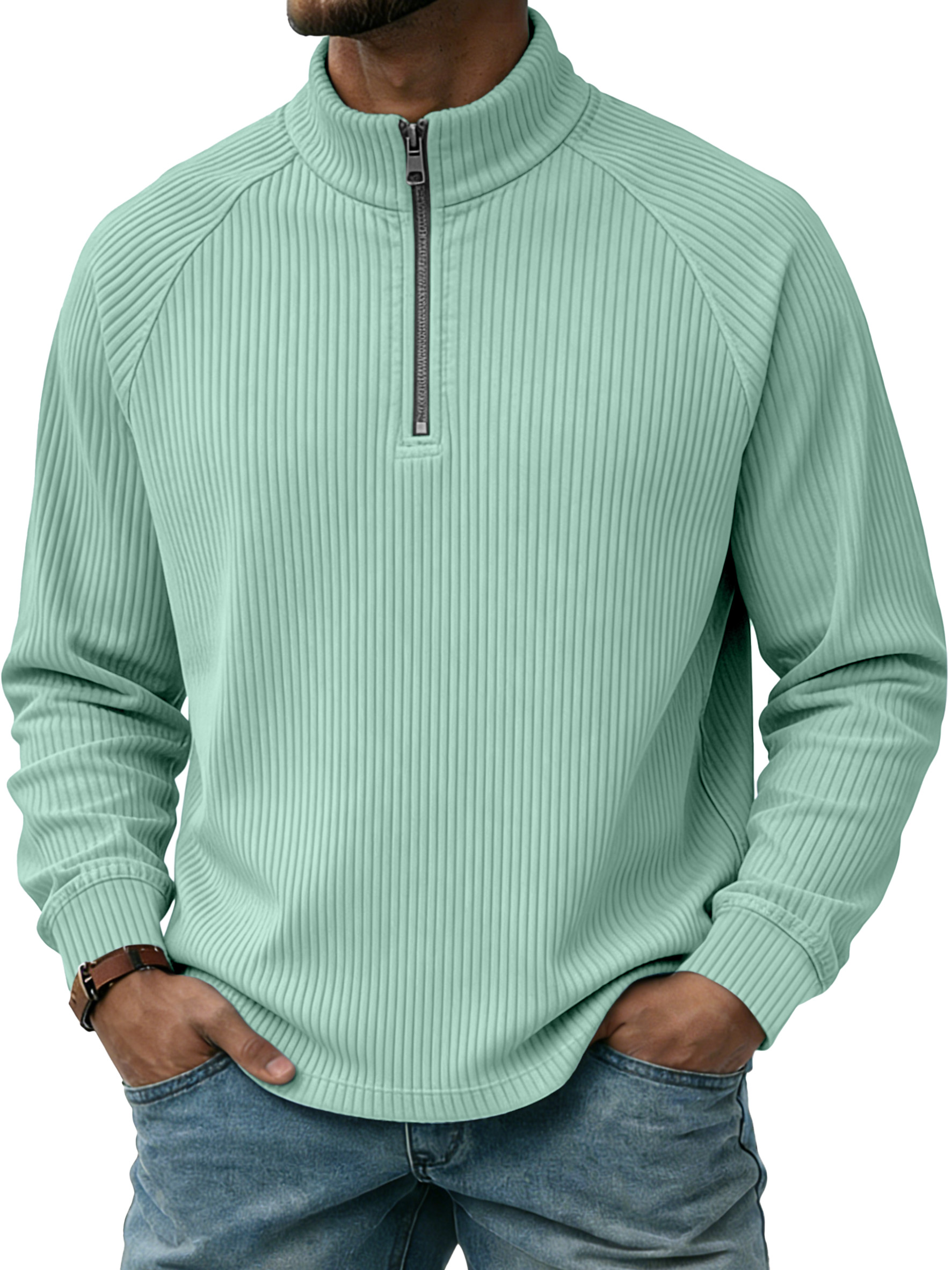 Men's Casual Simple Vertical Stripe Zip-up Stand-collar Raglan Sleeve Polo Shirt