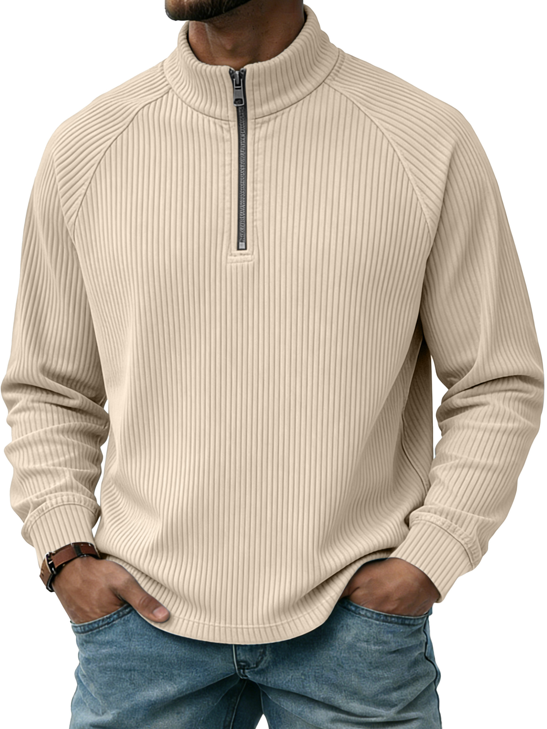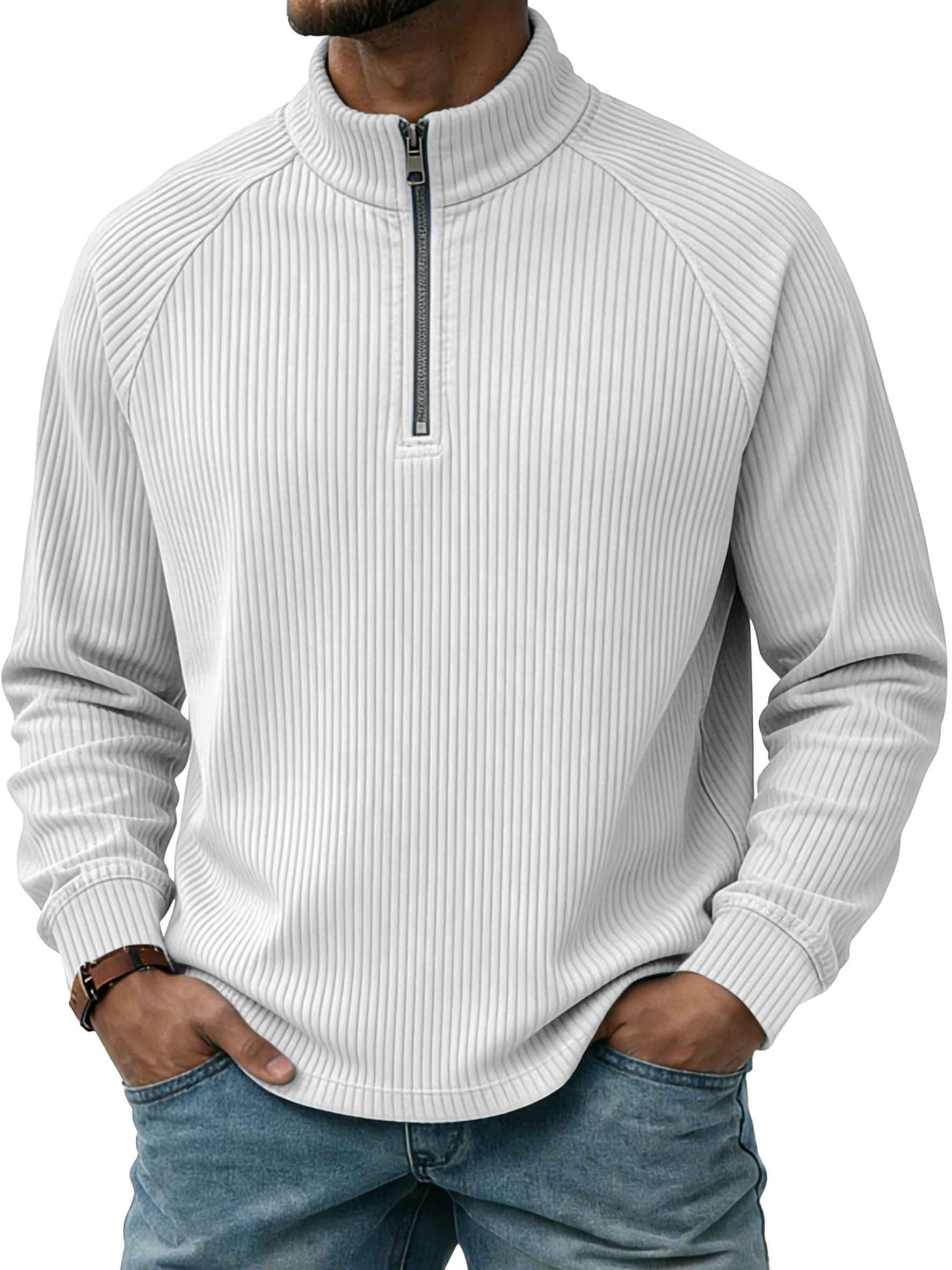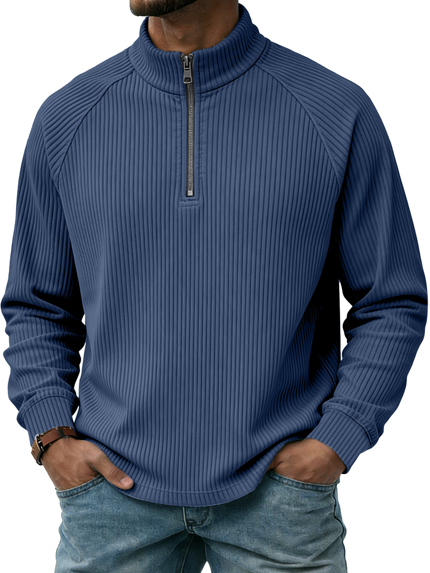 Men's Casual Simple Vertical Stripe Zip-up Stand-collar Raglan Sleeve Polo Shirt