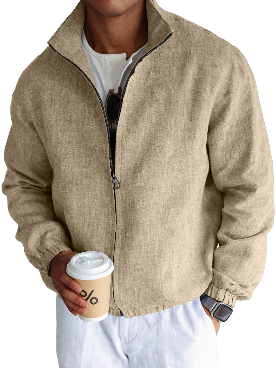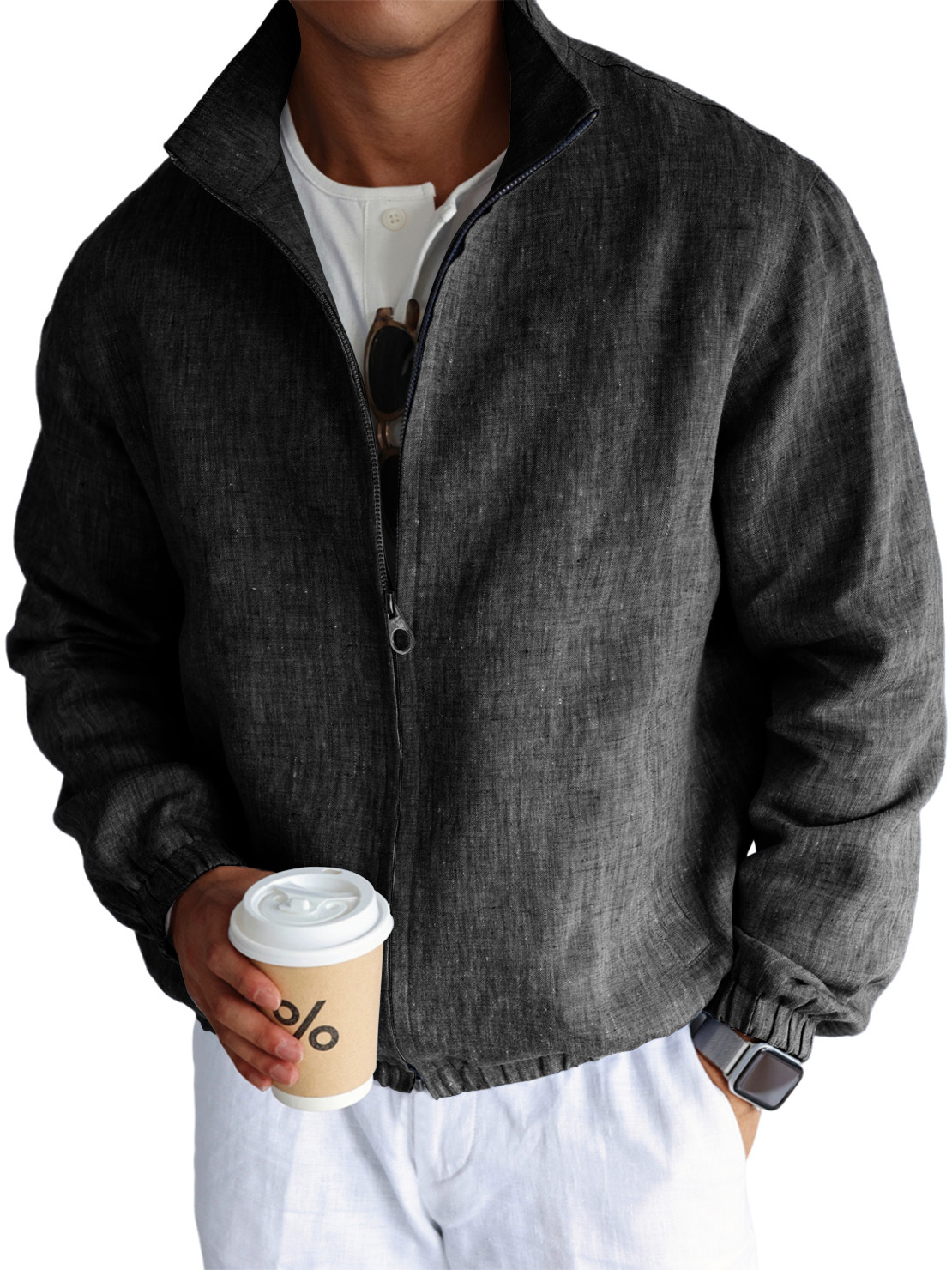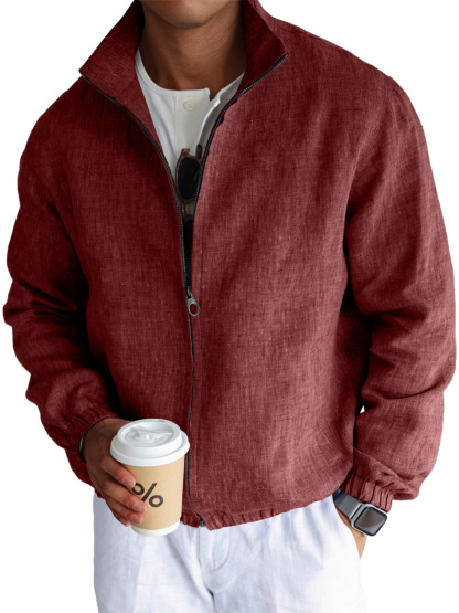 Men's Simple Casual Cotton And Linen Stand Collar Zipper Jacket