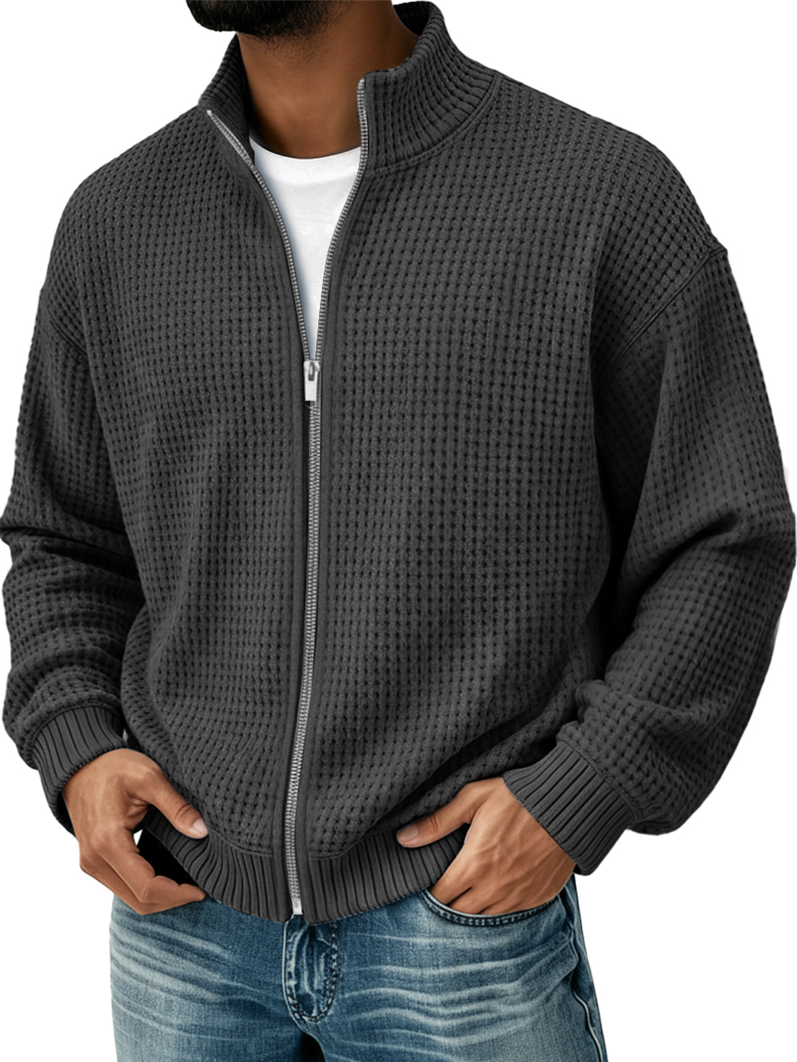 Men's Simple Stand Collar Waffle Casual Zip-Up Jacket