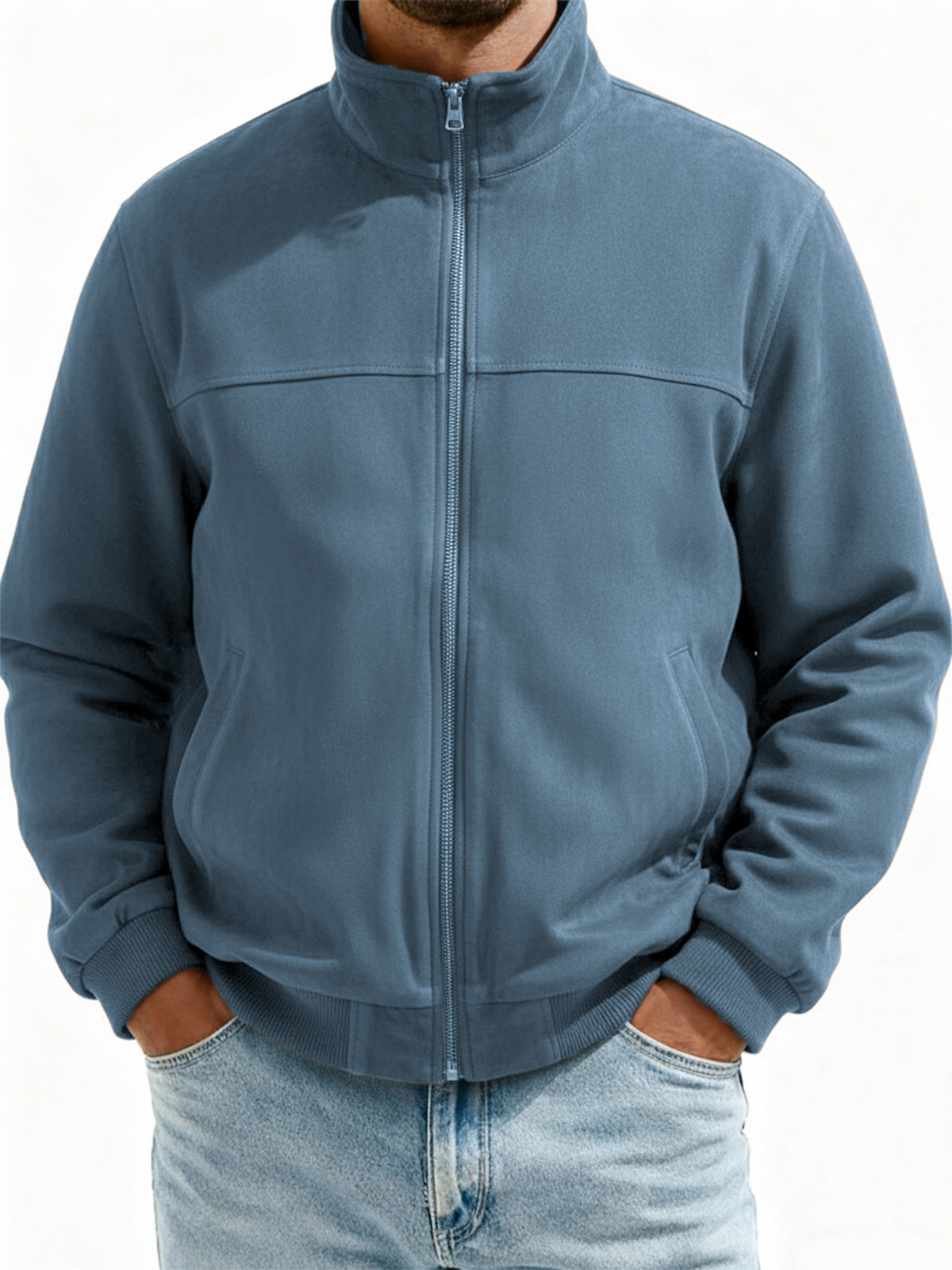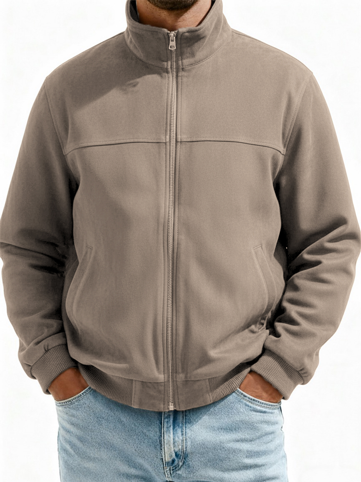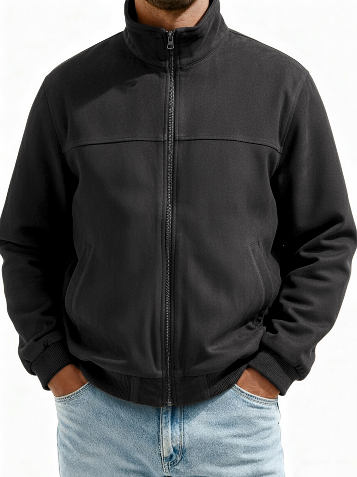 Men's Suede Zip-Up Flight Jacket with Minimalist Patchwork Design