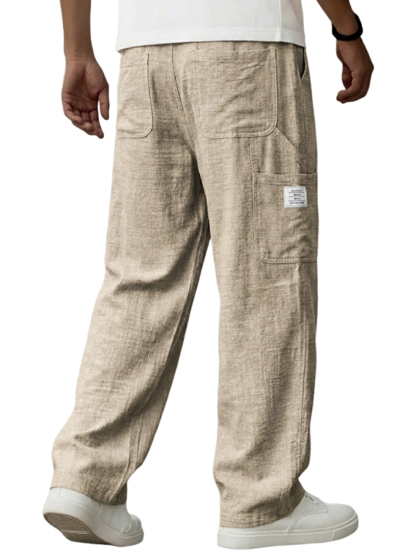 Men's Vintage Breathable Linen Multi-pocket Casual Embroidered Label Trousers