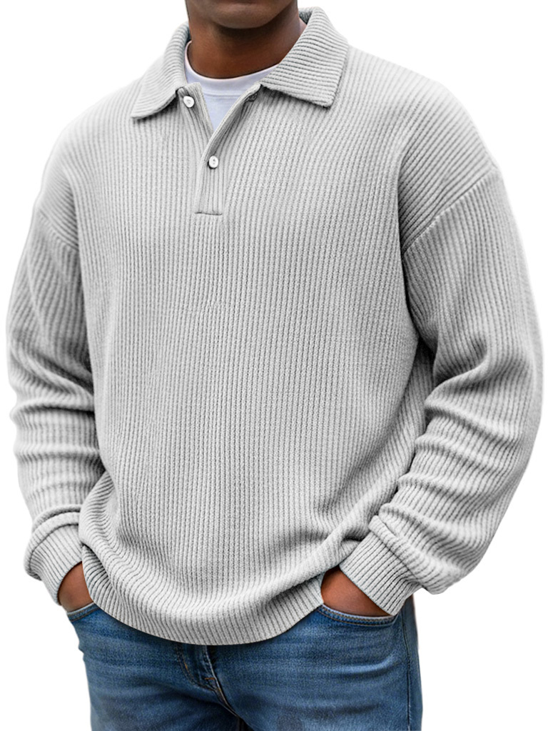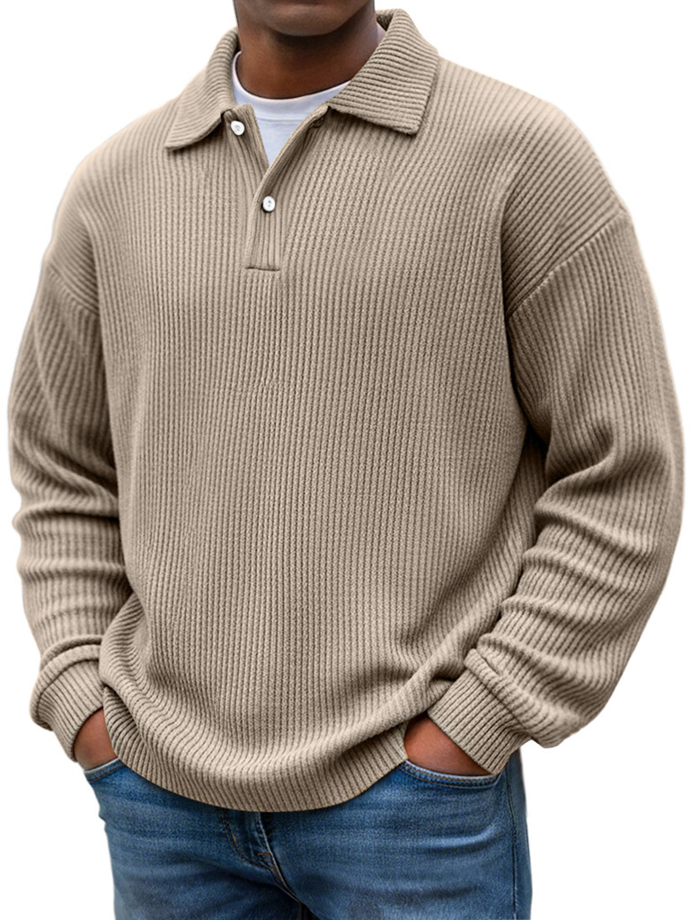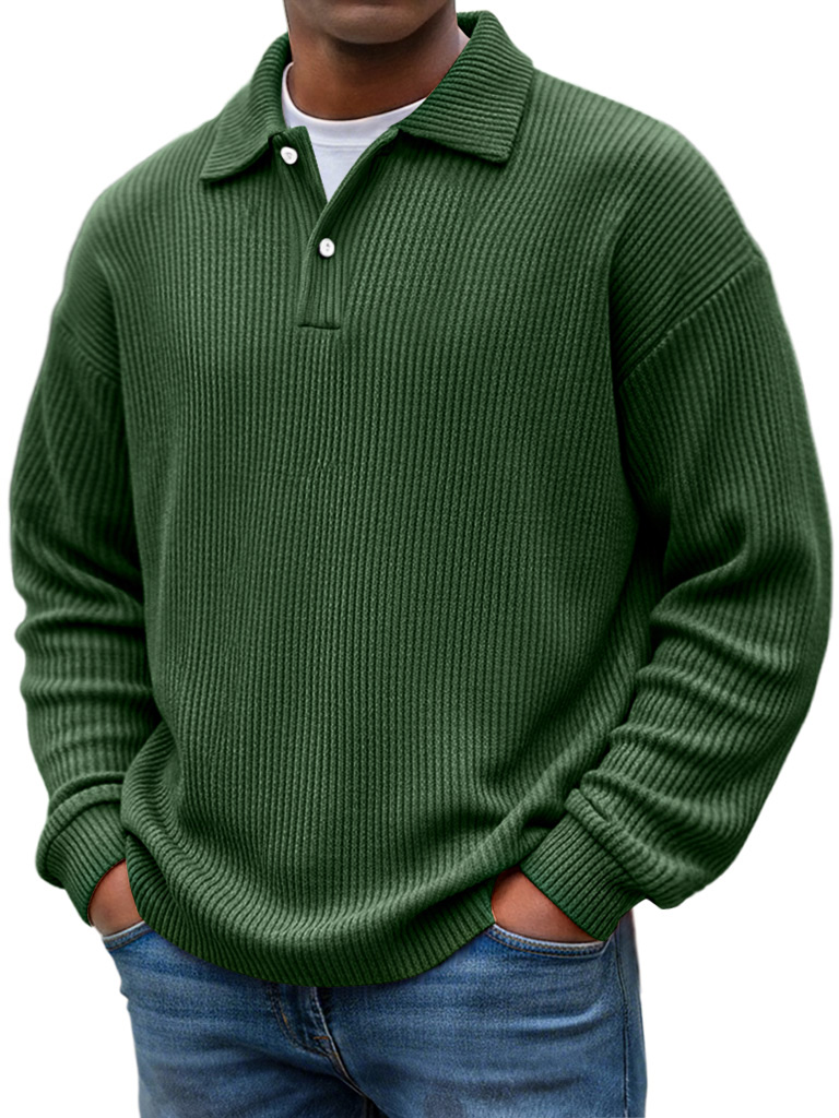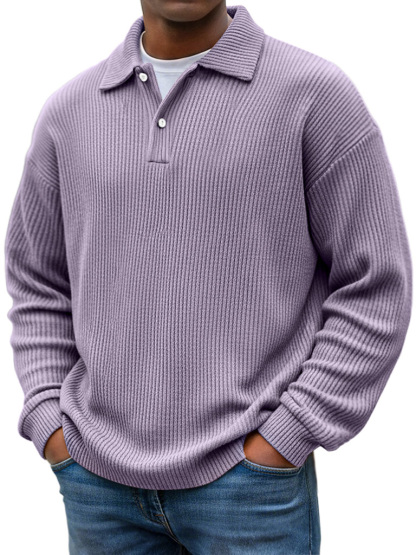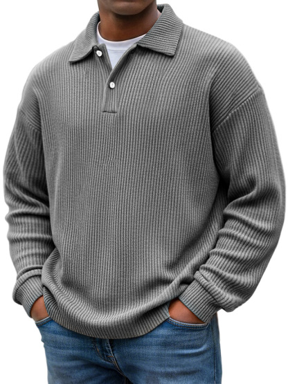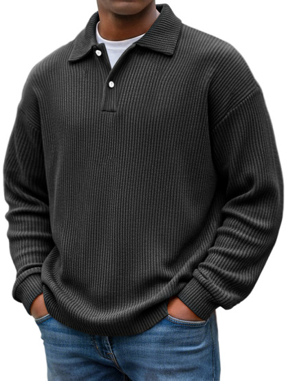 Simple Ribbed Texture Lapel Button Casual Long-sleeved Polo Shirt