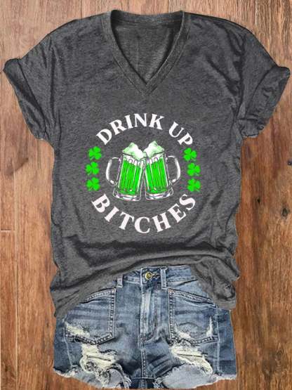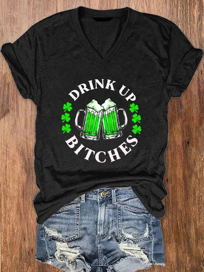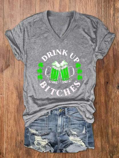 St. Patrick's Day Drink Up Bitches Print V-Neck T-Shirt